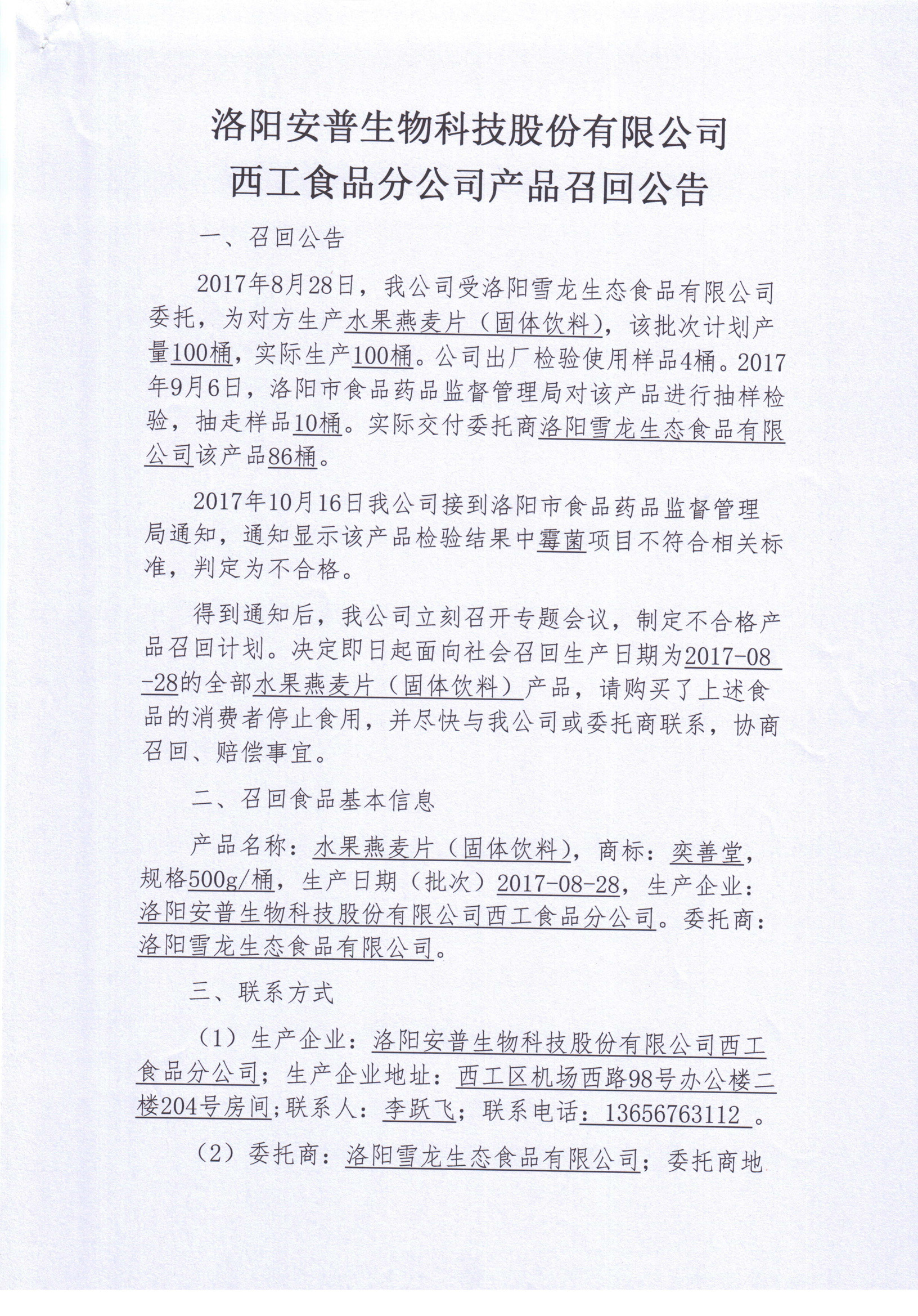 洛陽安普生物科技股份有限公司西工食品分公司產品召回公告